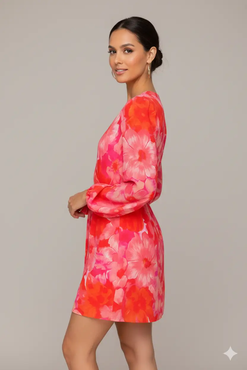 Turn heads and make an unforgettable statement with this vibrant red and pink dress! Featuring flirty, fluffy sleeves that add a whimsical touch, this dress is perfect for anyone who likes their fashion bold and unmissable.