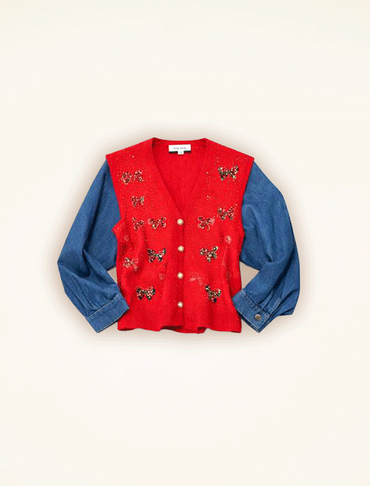 Eye-catching red cardigan with denim sleeves and intricate butterfly beadwork for a bold, texture-rich fashion statement.