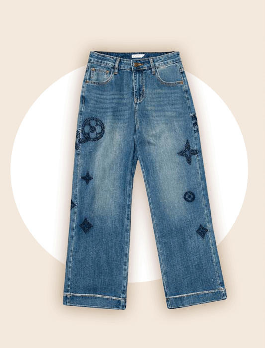 Versatile medium-wash jeans featuring tonal embroidered star and circular motifs for a subtle designer aesthetic. Crafted with a comfortable straight-leg cut and classic five-pocket styling for elevated everyday wear.