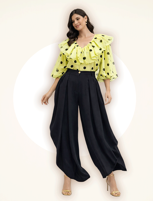 Make a vibrant statement in this lime green blouse featuring a dramatic ruffled V-neckline and classic black polka dots. The voluminous puff sleeves and lightweight fabric create a playful yet sophisticated silhouette for any occasion.