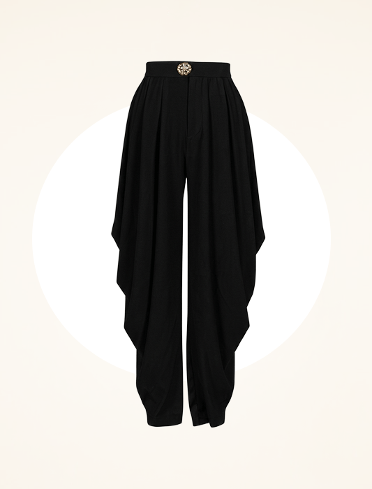 Dramatic high-waisted trousers featuring sculptural side draping and a shimmering crystal-embellished waistband. The fluid, wide-leg silhouette creates a sophisticated red-carpet-ready look for your next formal event.