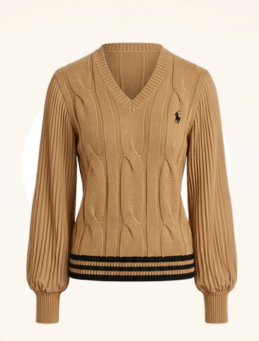 A chic twist on a classic v-neck, featuring traditional cable stitching and striking pleated balloon sleeves. Finished with varsity-style striped ribbing at the hem for a sophisticated, athletic-inspired look.