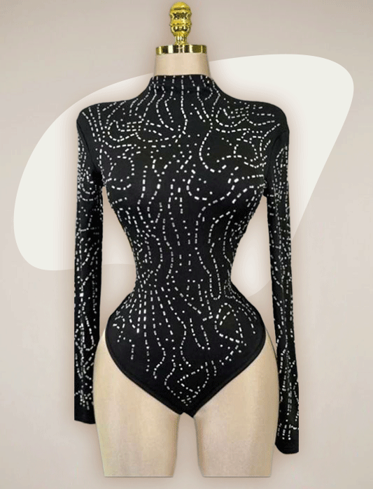 This stunning bodysuit features an intricate, swirl-like pattern of shimmering silver rhinestones set against a sleek, midnight-black backdrop.