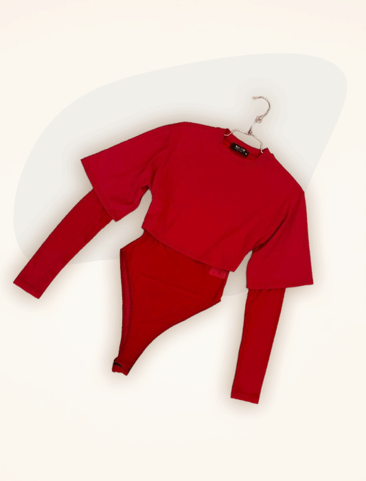 Vibrant red layered bodysuit with a sleek cropped top overlay for a modern, high-impact contoured silhouette.
